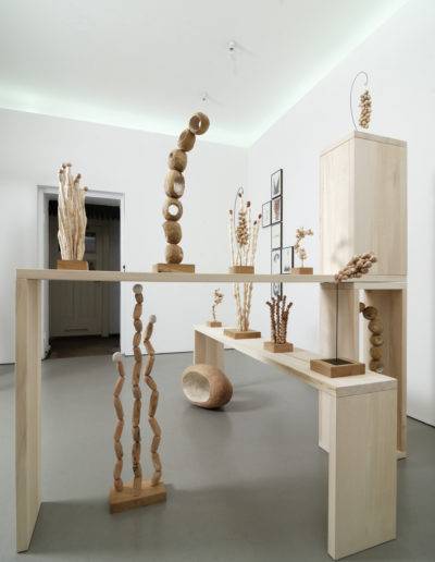 neuen Kontext zu positionieren, die Tradition aufzugreifen und doch seine eigene, losgelöste Sprache zu finden. Der Aufgriff natürlicher Formen erschöpft sich nicht in seiner reinen Wiedergabe, sondern erfährt eine kontinuierliche Umformung und Neuordnung. Hierbei erschafft der Künstler eine universelle Verbindung, die nicht auf ein kulturell geprägtes Verständnis begrenzt ist. Die Arbeiten wirken vertraut und fremd zugleich. Im Spannungsfeld mit den eigenständigen Zeichnungen – sie können als abstrakte Chiffren für die der Natur entlehnten bzw. interpretierten Formen verstanden werden – sowie die Präsentation der Skulpturen in kubischen Metallrahmen und tisch-und regalartige Podestbauten, kann die Ausstellung wie ein Spaziergang durch einen eigenwillig gestalteten Garten erfahren werden.