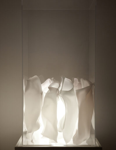Zentral in der Mitte des Raumes leuchtet die große Hängeskulptur Negligé Illuminé zart in den Raum hinein. Wie ein Gemälde aus einer anderen Zeit – man könnte an Malereien von Georgia O’Keeffe oder Tamara Lempicka aus der Zeit der Klassischen Moderne denken – entfaltet sich organisch in großen faltenreichen Schwüngen, sich aufblätternd die an eine kopfüber hängende Rosenblüte erinnernden Form. Die vielen Schichtungen mit ihren schwungvollen Falten lässt die im Inneren hängende Lichtquelle unterschiedlich stark durchscheinen. Das diaphane Material des Polypropylens verstärkt die Präsenz dieser divergierenden Lichtgestalt. Auch an das kostbar sich auffaltende Gewand einer mittelalterlichen Madonnenfigur könnte man denken. Im Kontext der streng geometrisch und nüchtern weißen Ladenmöbelarchitektur des KioskShopformuliert diese große organische Form einen spannungsreichen Kontrast, und dient zugleich als Materialklammer: Das milchig weichzeichnende Kunststoffmaterial korrespondiert ideal zum gebleichten Bienenwachs der Product Sculptures, ist beides in seiner Erscheinung semitransparent und diaphan. Besucher halten oft das Propylen für Wachs.
