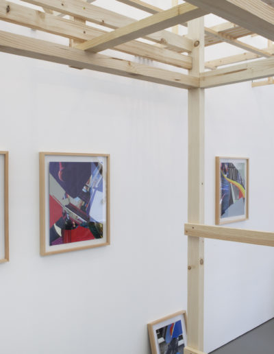 In seiner Ausstellung Akasha geht der Künstler allerdings weiter. Seine architektonische Konstruktion im Raum – sie leiht der Ausstellung den Namen – ist als eine Fortsetzung seiner Grundprinzipien von Geschwindigkeit/Zeit und Raum in der dritten Dimension zu verstehen. Aus gehobeltem Kantholz hat der Künstler eine ‚Archistruktur’ geschaffen, die die Bewegungen seiner Malereien und Collagen aufnimmt, diese zitiert und in den Raum hinein ‚weiterspinnt’. Neben der ästhetisch spannenden Auflockerung der Ausstellungsinszenierung verweist dieses Konstrukt klug auf die Wesenhaftigkeit seiner Kunst. Schon das Strebewerk 1, (UdK-Meisterschülerarbeit, 2014), Strebewerk 2 (kurz danach in der Gruppenausstellung Berlin Masters by Arndt zu sehen und Strebewerk 3, zu erleben bei mir im letzten Frühherbst), verweisen minimalistisch in ihrem Aufbau auf die architektonisch dynamische Eigenschaft seiner zweidimensionalen Werke. Im letzteren wird das Strebewerk gar Teil der Malerei oder umgekehrt, weil es direkt eingebunden ist in den voraus geplanten Leerstellen im Strebewerk.