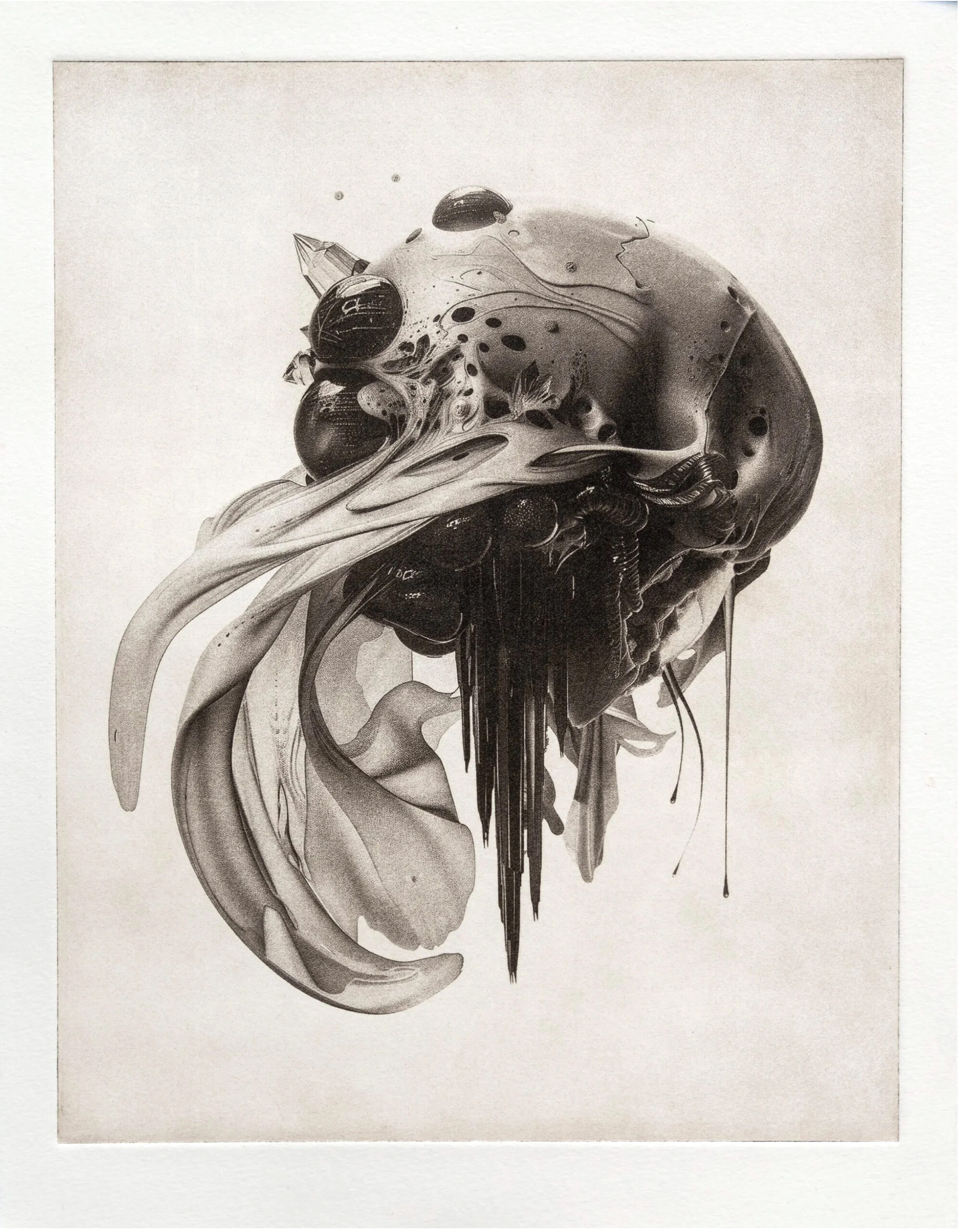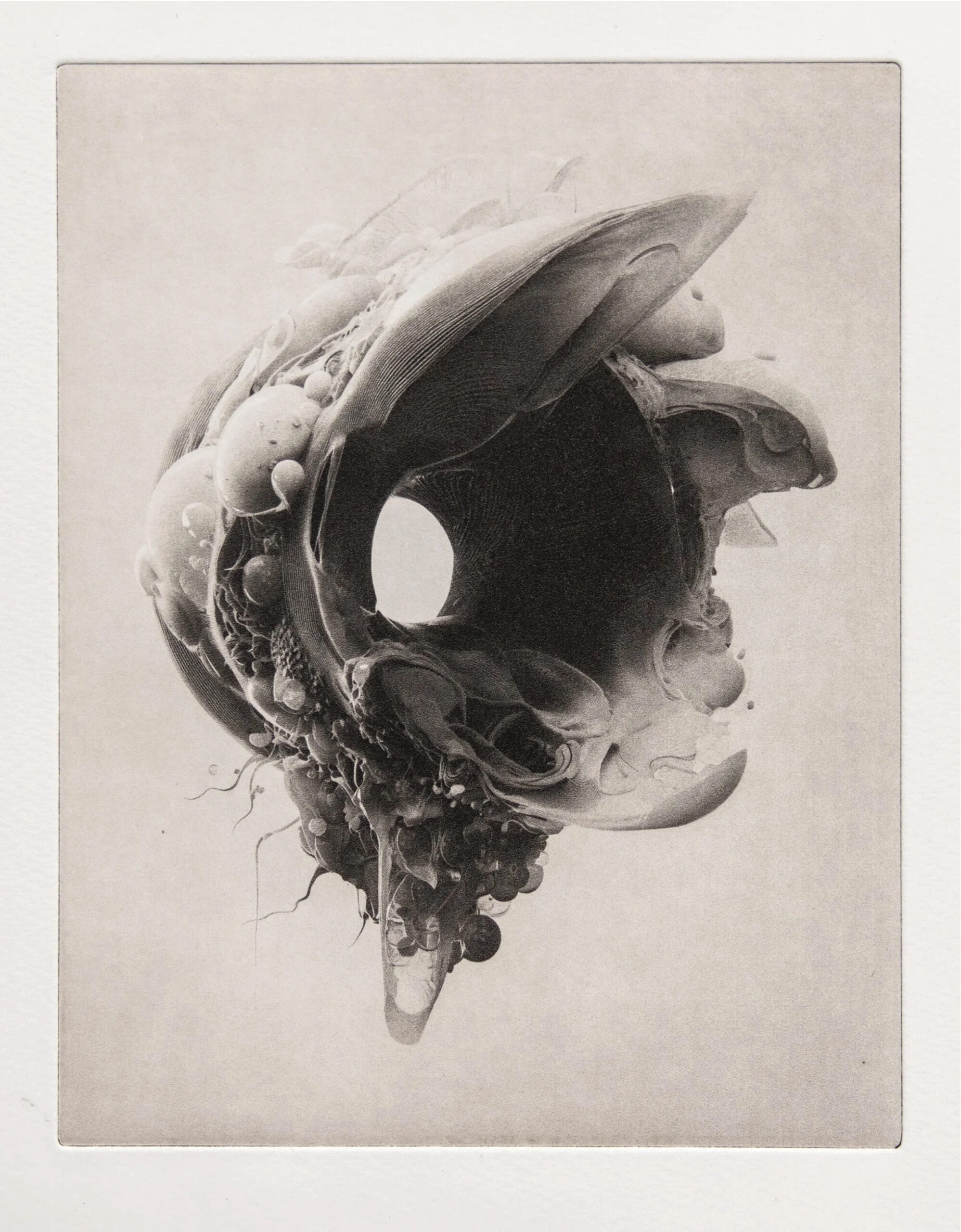 »echønoeë« is an unfolding series of photogravure prints developed through a dialogue between AI-generated imagery and traditional printmaking. Emerging from the Crosscurrents exhibition, which explored coastal ecologies and speculative sculptural forms, the series imagines liminal beings—creatures washed ashore, hinting at worlds below the surface. Each image is generated through a mixture of text and visual prompts, seeking a sensory, haptic visuality that unsettles the boundary between the real and the imagined. Rather than remain in the digital realm, the forms are translated into copper plates and printed by hand, bringing speculative digital encounters back into the tactile register of ink, paper, and press. The series reflects an ongoing exploration of responsiveness to materials and environments, situating the prints as contingent artefacts of exchange—between artist and machine, digital and analogue, surface and depth.